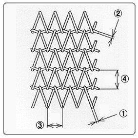 ① 스프링선의 굵기 ( ø) ② 핀선의 굵기 ( ø) ③ 스프링선의 센터간격 (m/m) ④ 핀선의 센터간격 (m/m) |